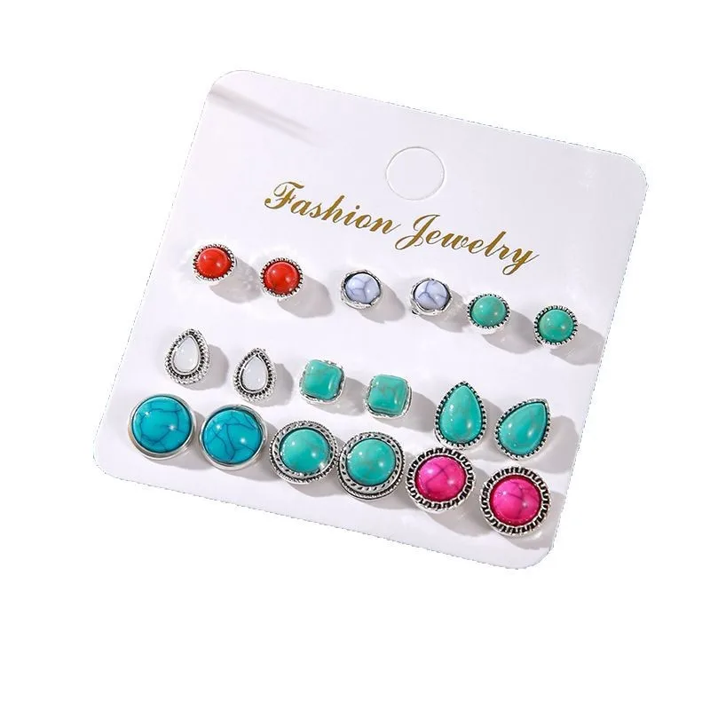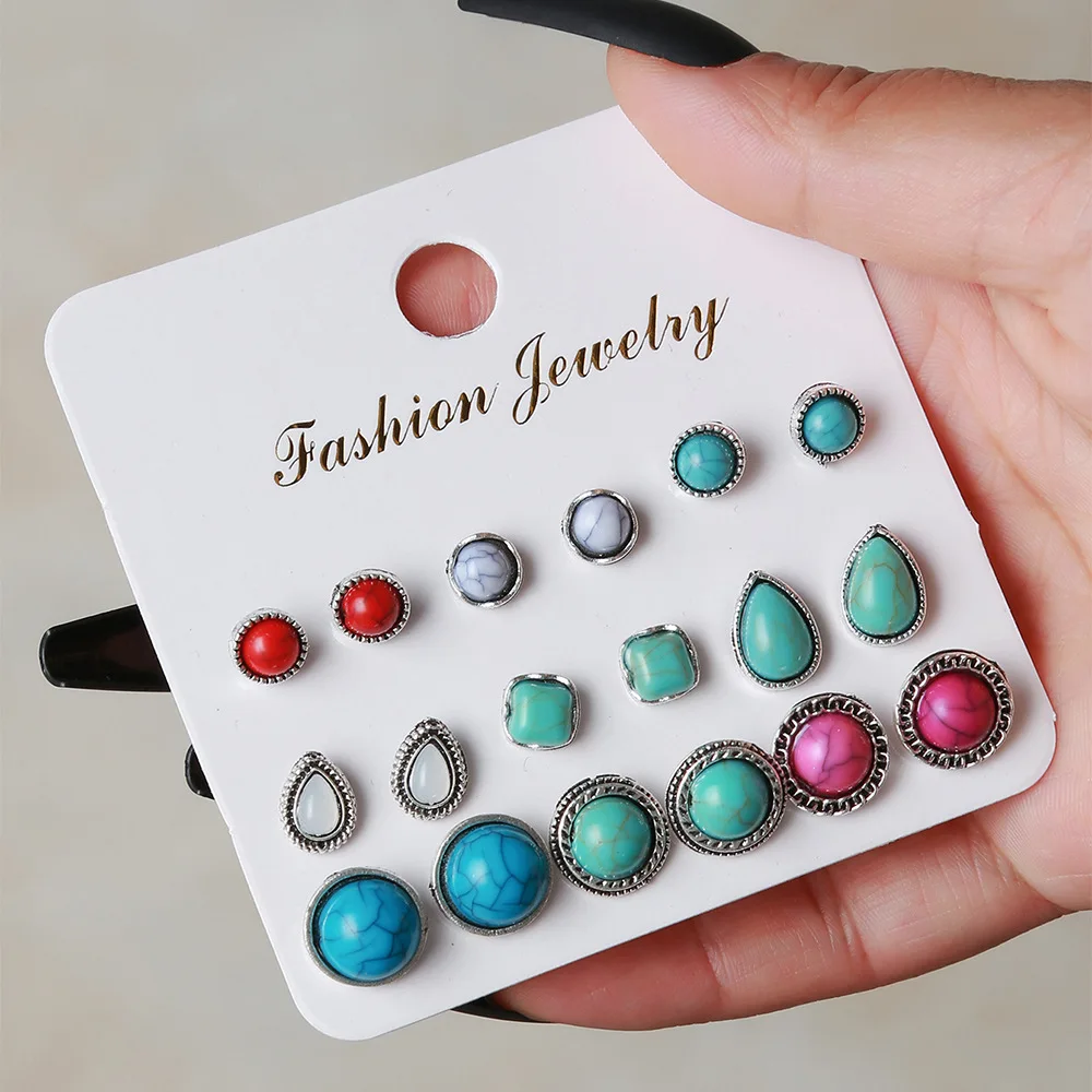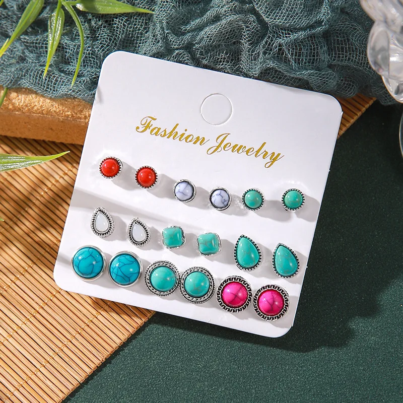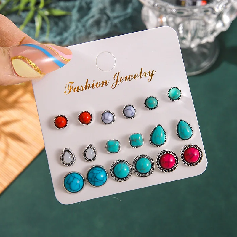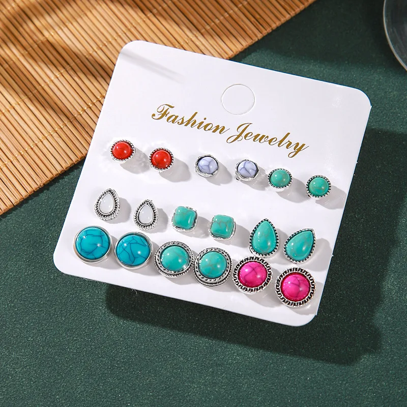 9 Pairs Western Turquoise Stud Earrings Cowgirl Boho Gemstone Small Geometric Square Round Studs Turquoise Jewelry For Women