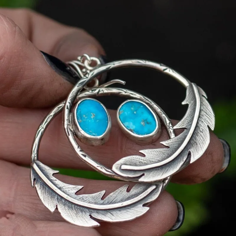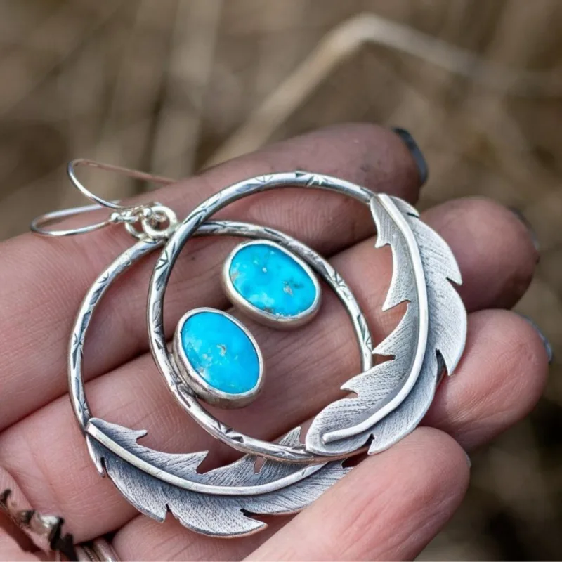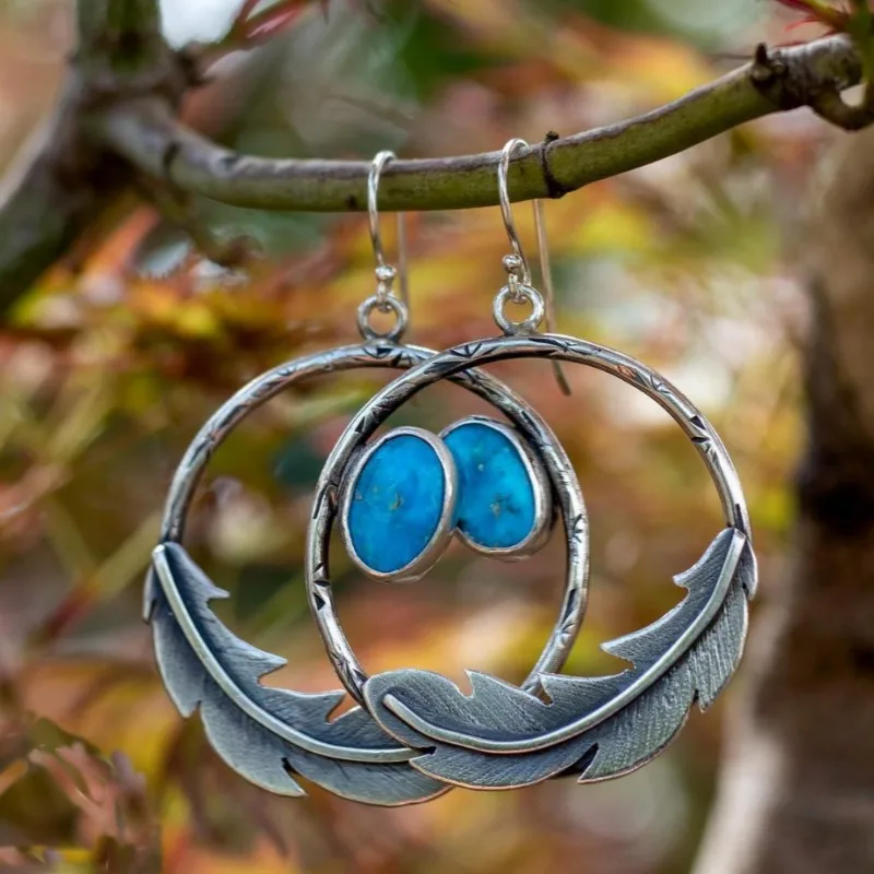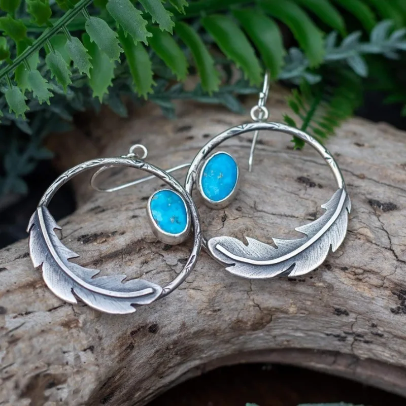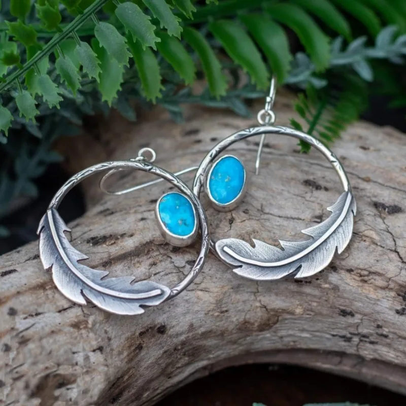 Bohemian Ethnic Faux Turquoise Round Feather Drop Earrings for Women Vintage Party Creative Personalized Jewelry Accessories