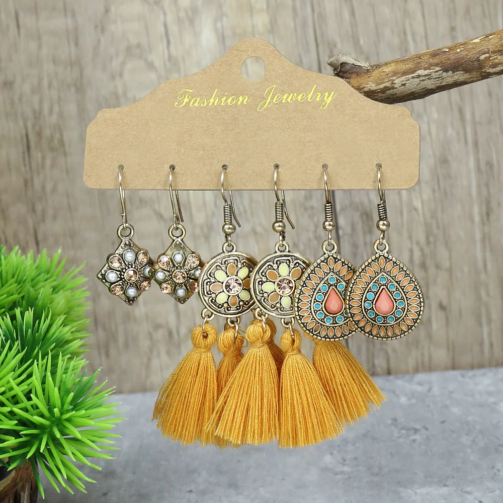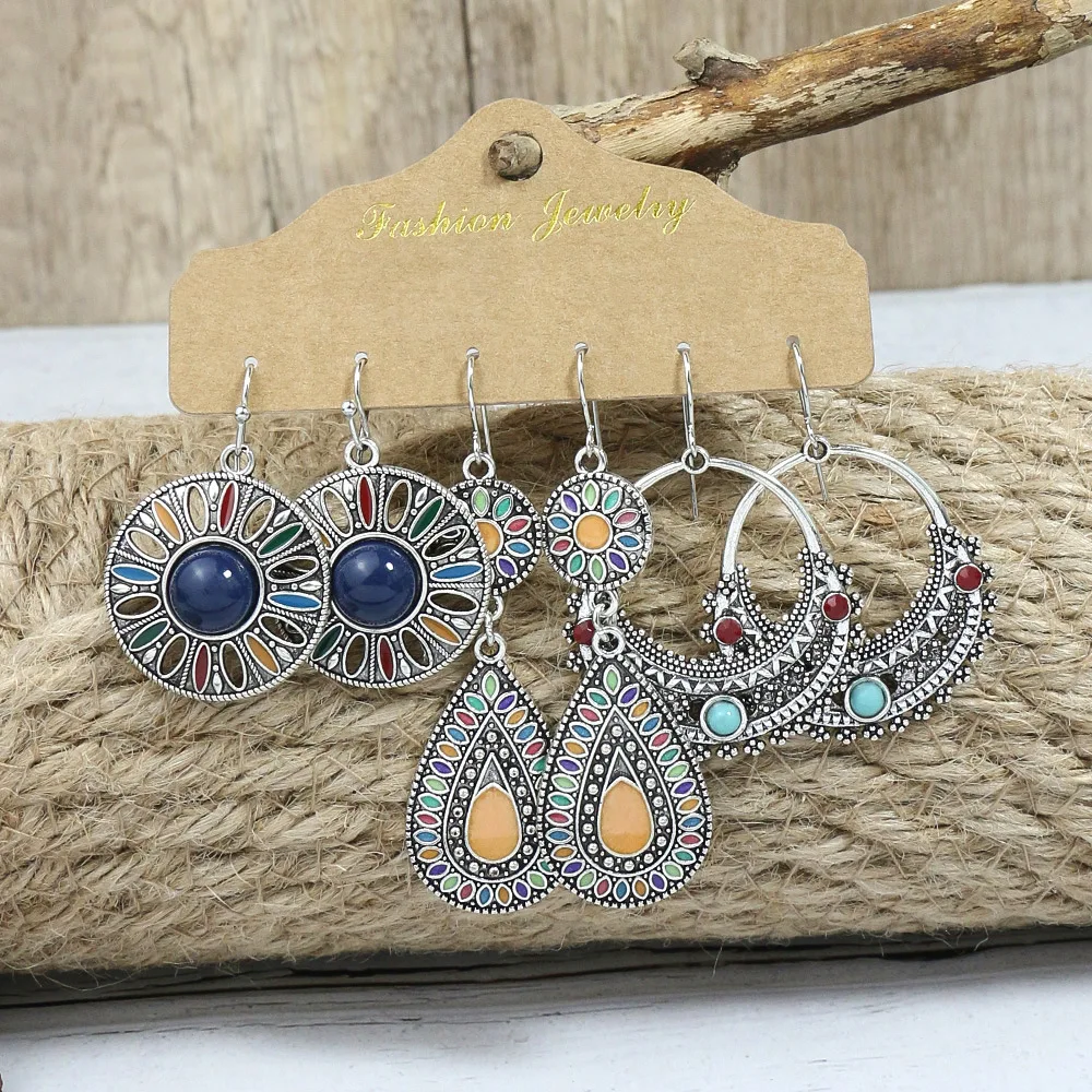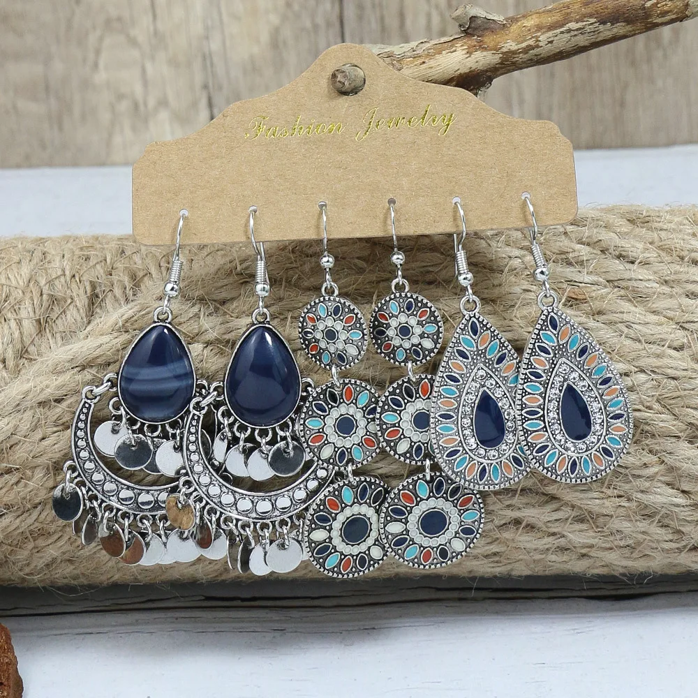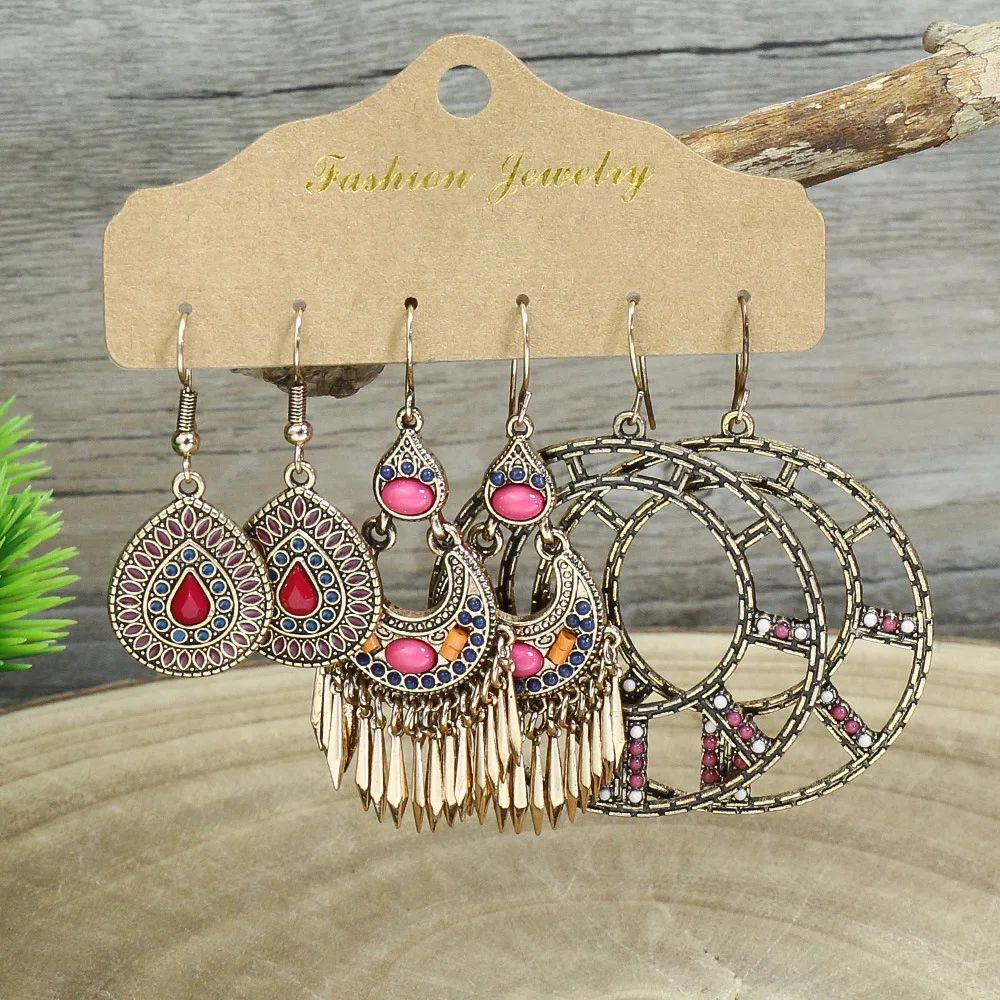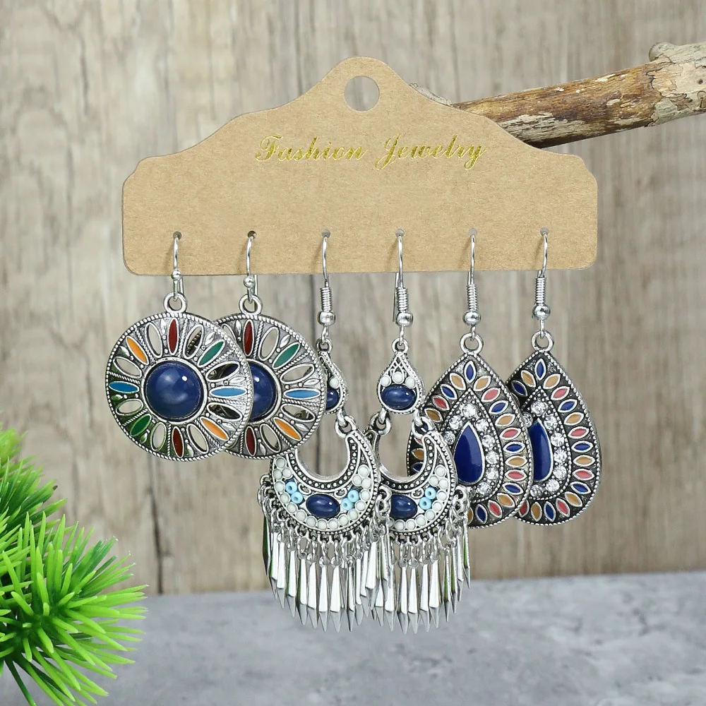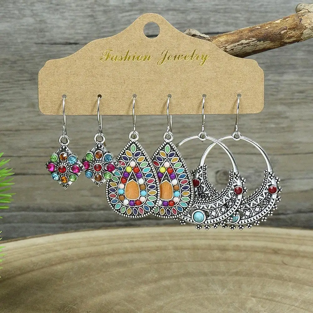 Bohemian Ethnic Style Earrings Set for Women Creative Retro Drop Oil Rhinestoen Water Drop Tassel Earring Female Jewelry