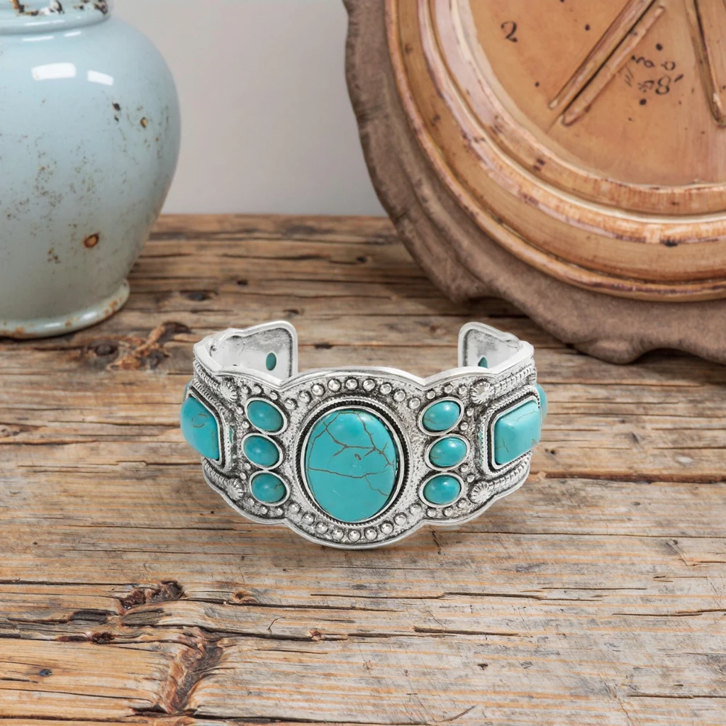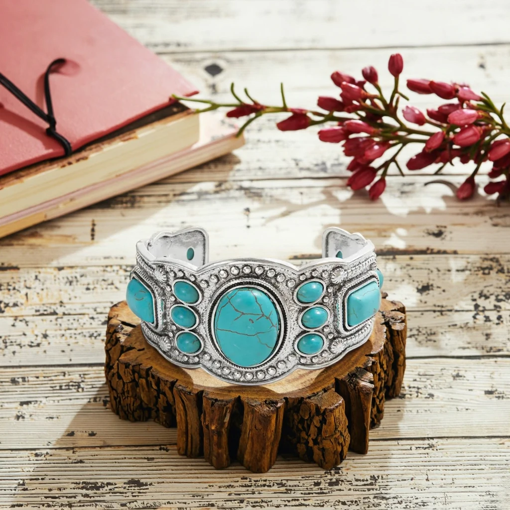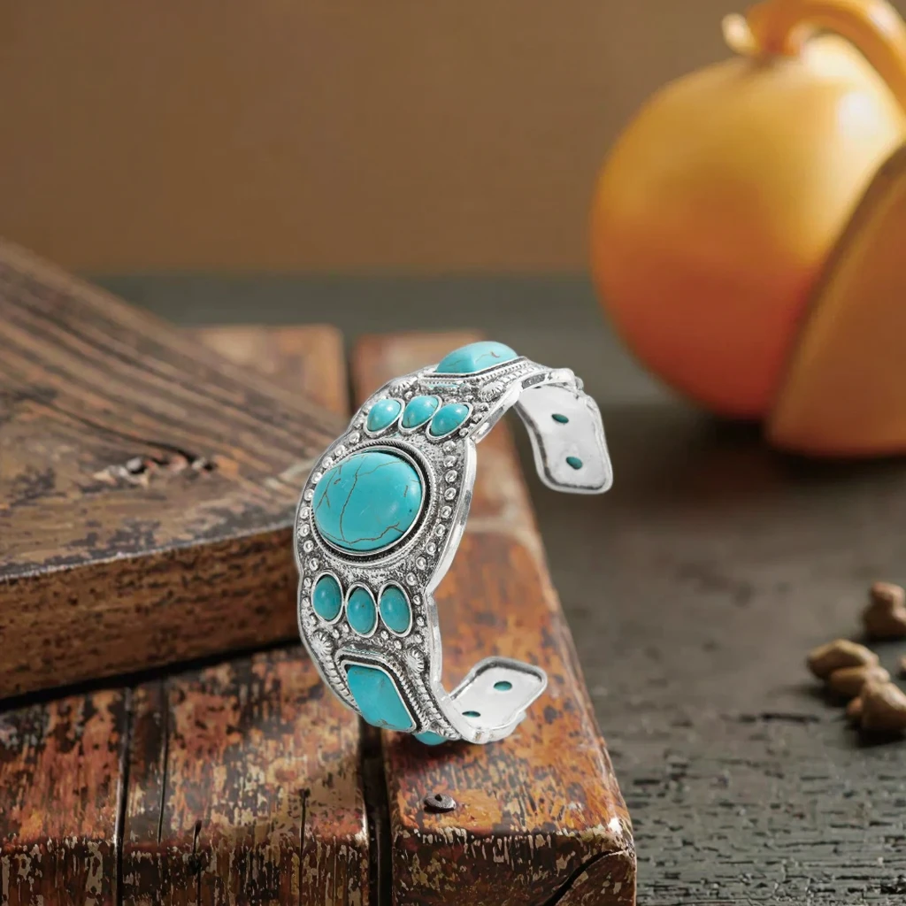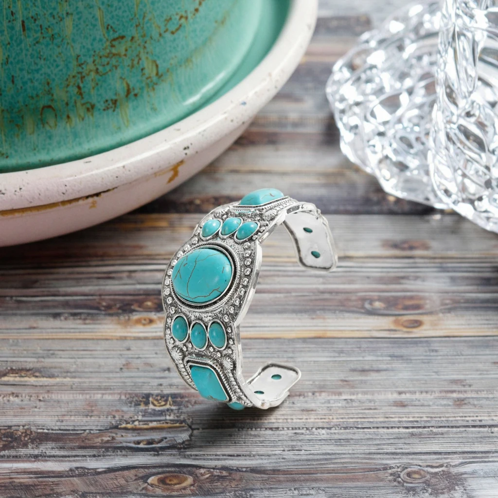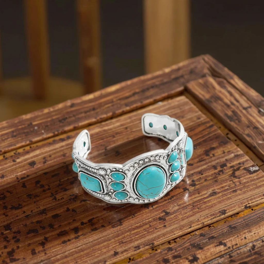 Handcrafted Wide Bangle with Turquoise Stone December Birthstone Bracelet for Daily Wear Bohoturquoise-Inspired Cuff Bracelet