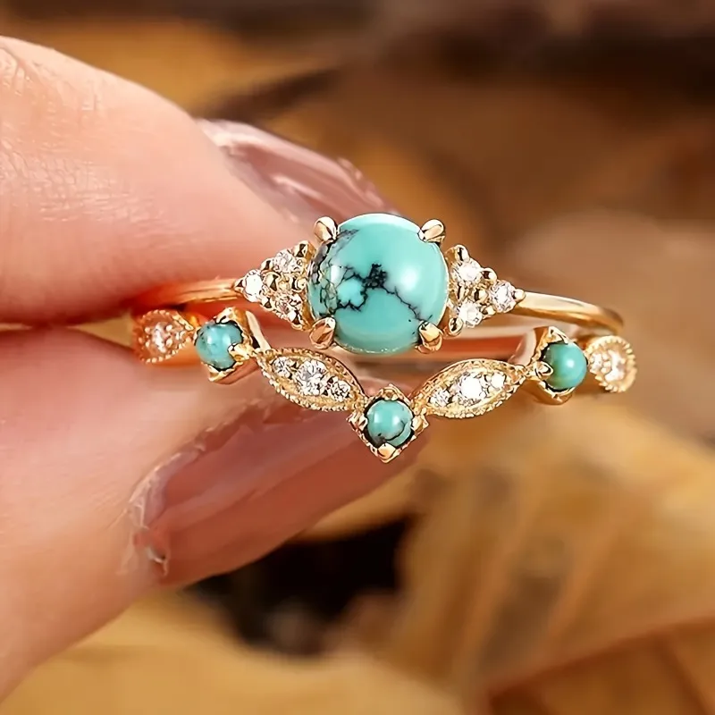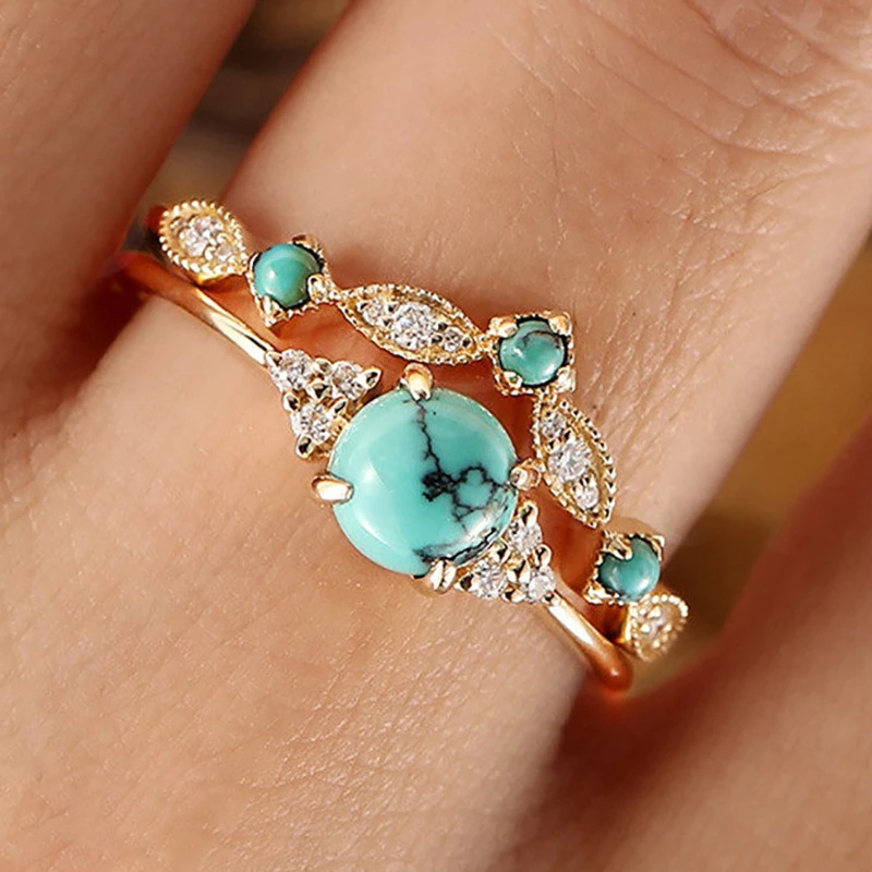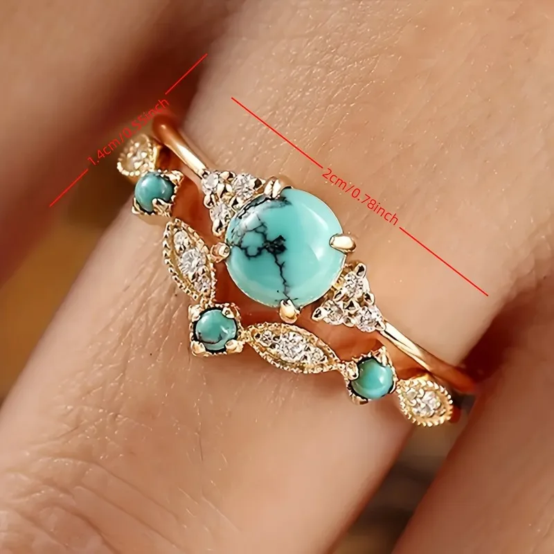 New Bohemian Imitation Turquoise with Cubic Zirconia Double Layer Ring Women's Classical and Elegant Jewelry Accessories
