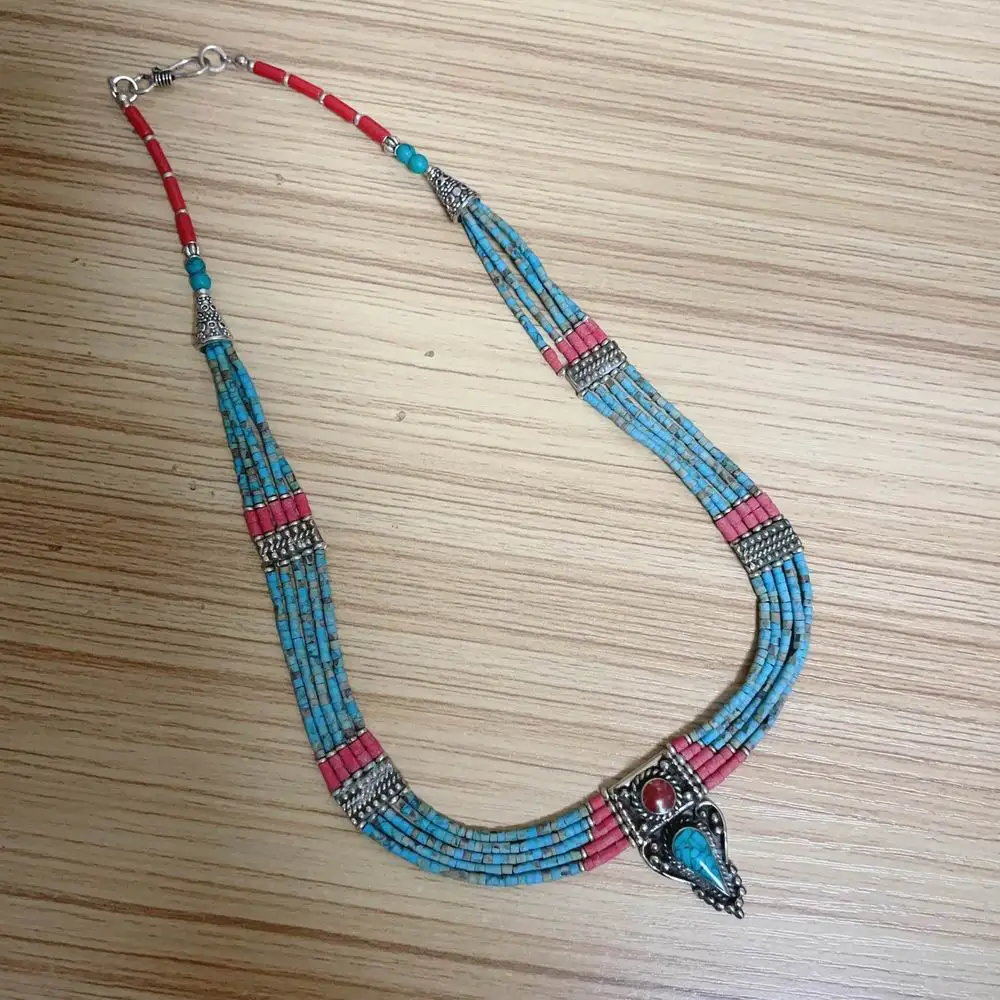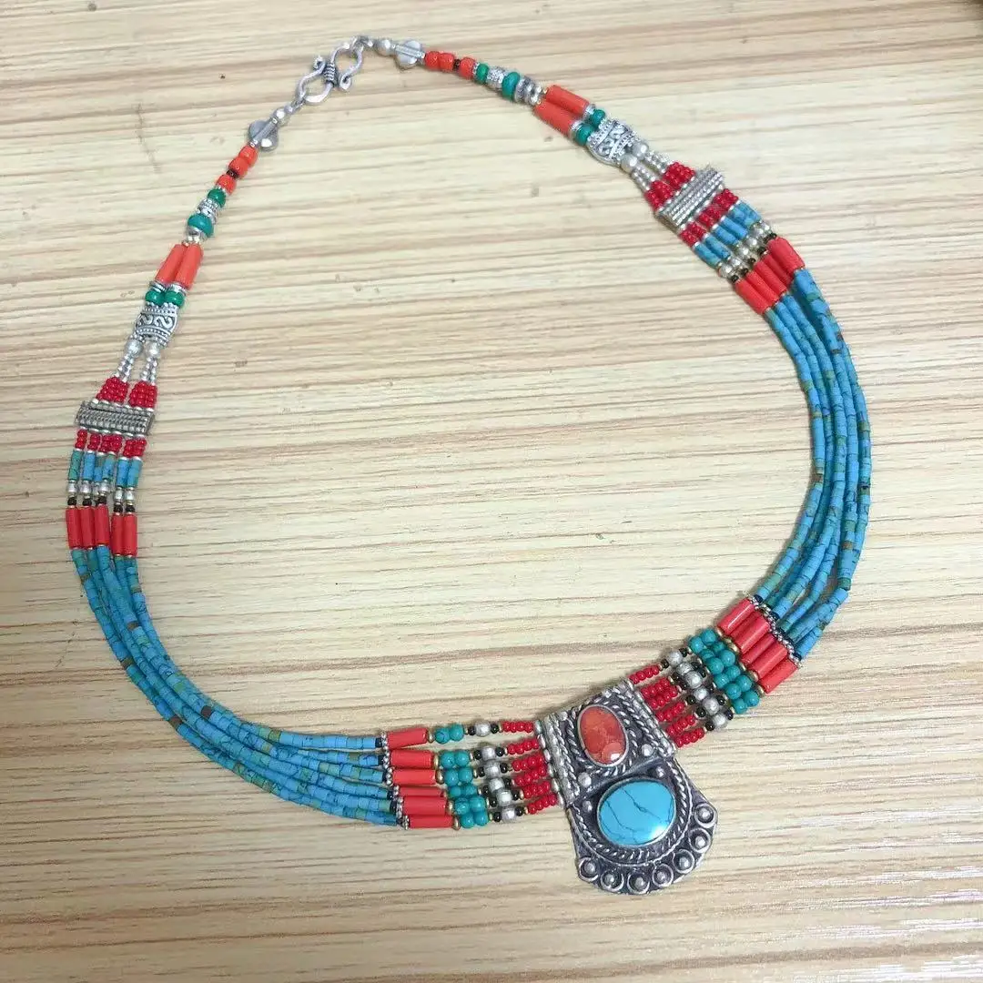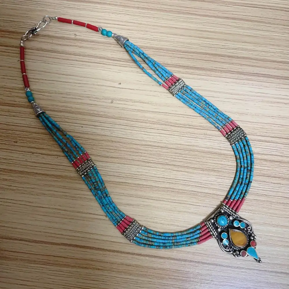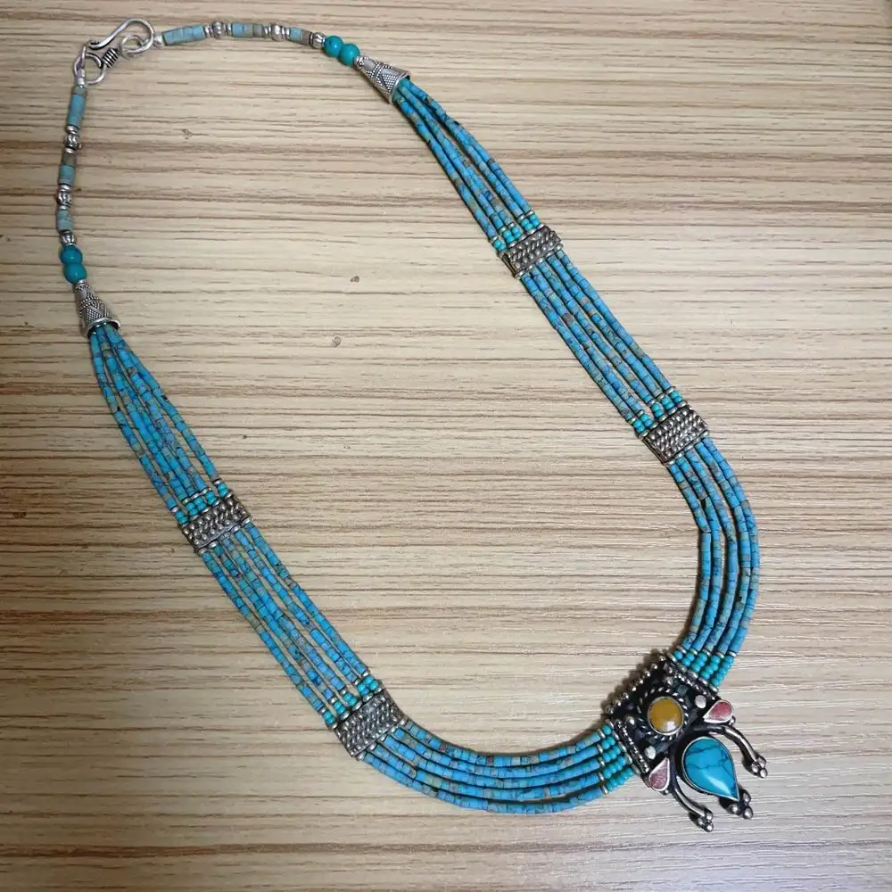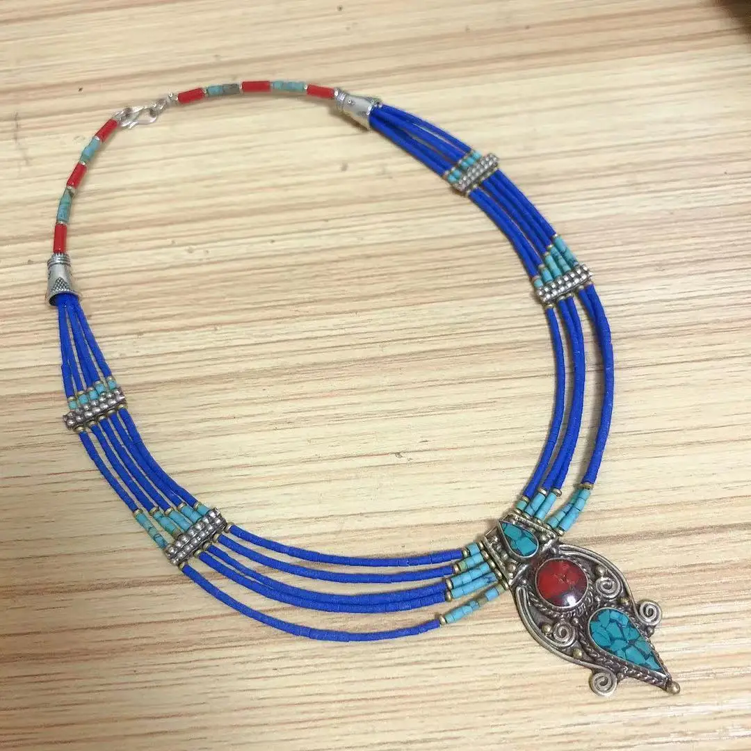 NK242 Nepal Handmade Copper Inlaid Lapis Colorful Stone Pendant Necklace Ethnic Tibetan 5 Layers Beaded Necklace