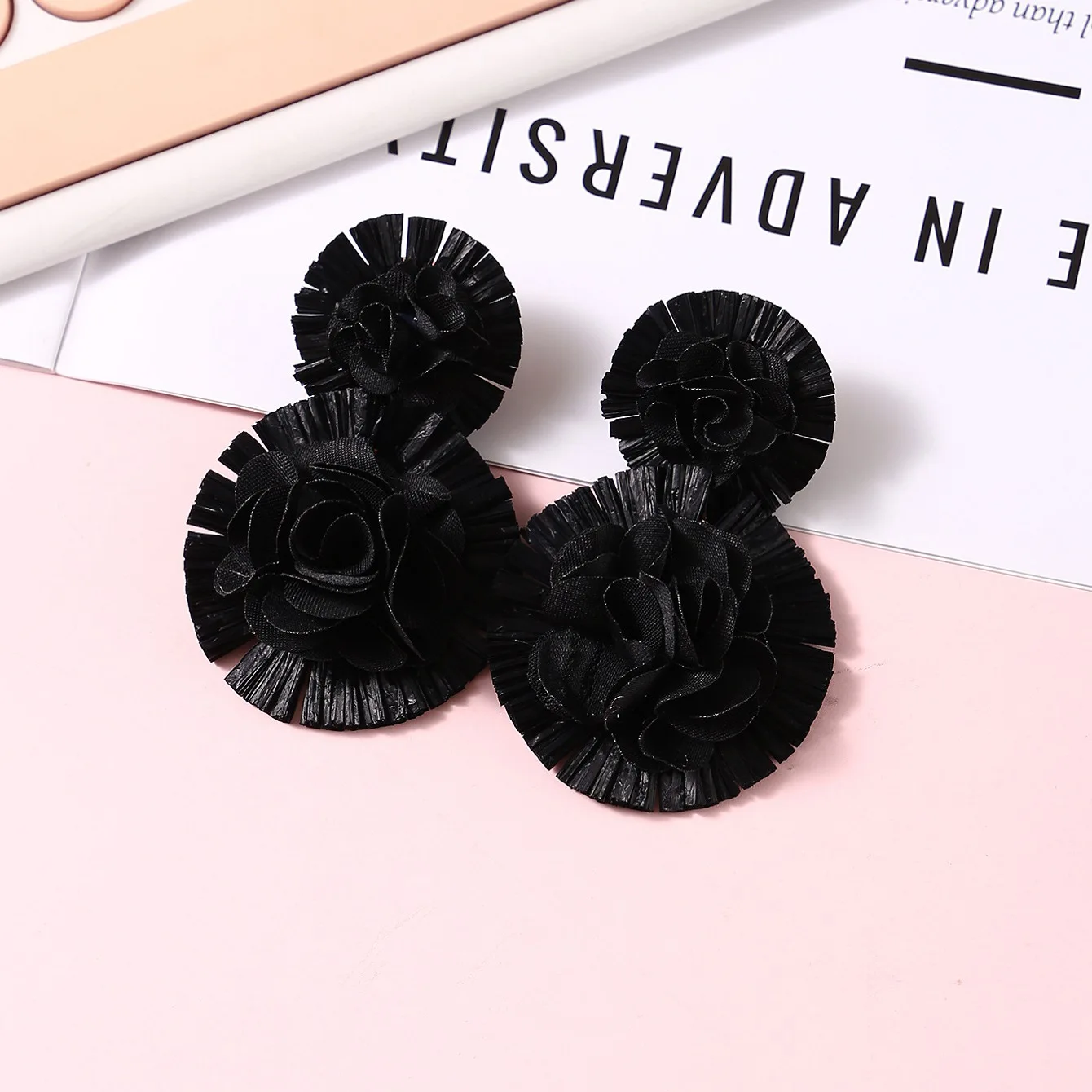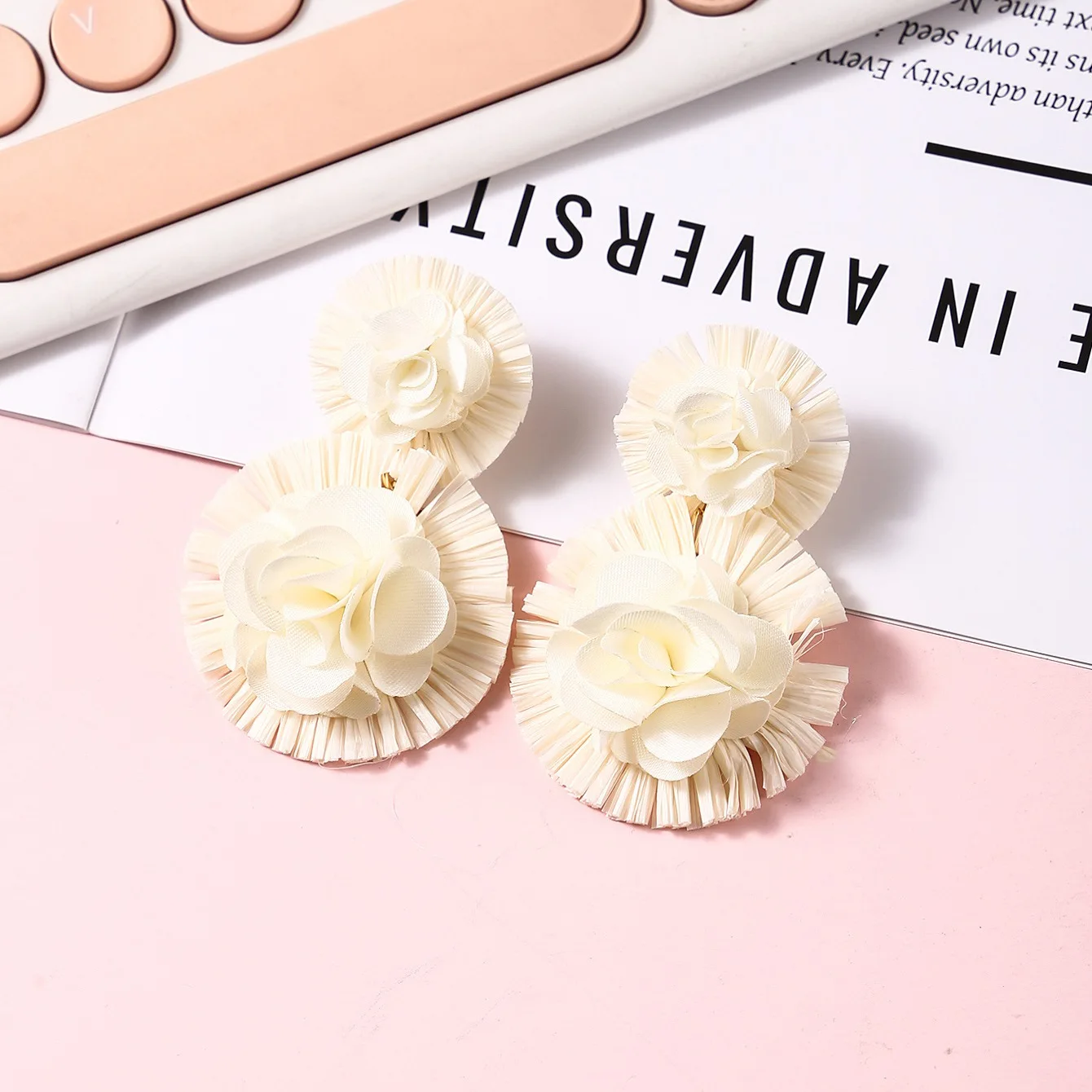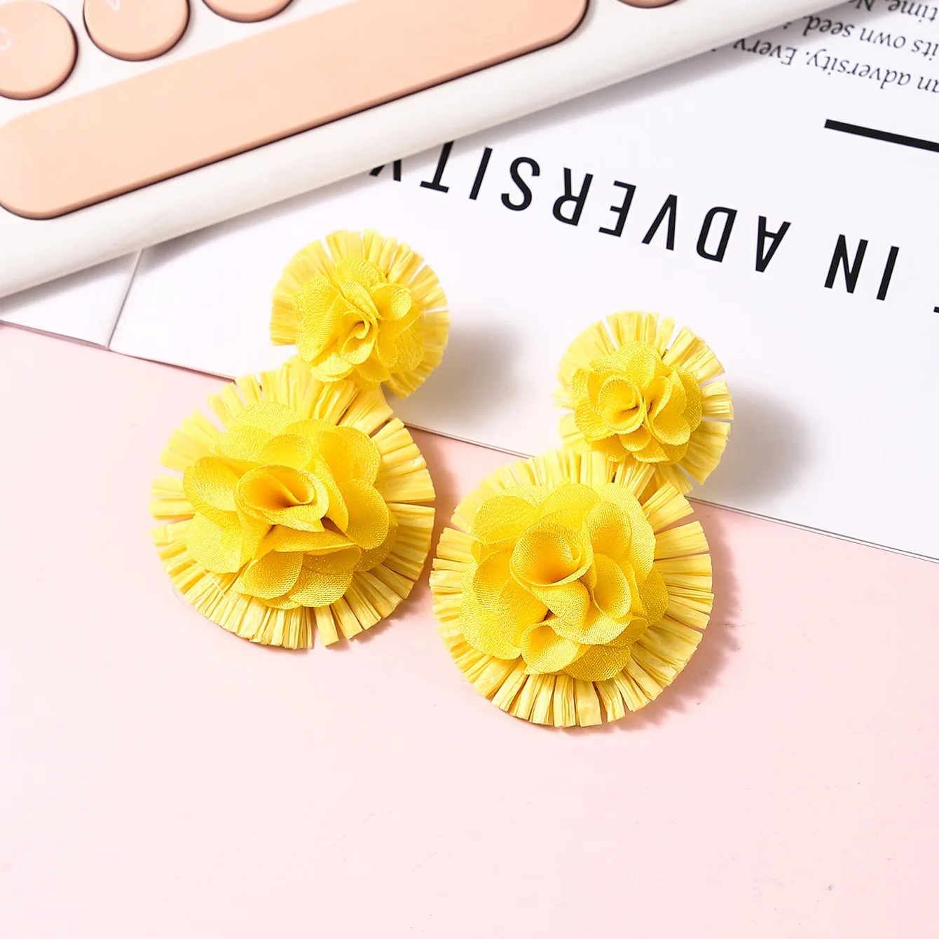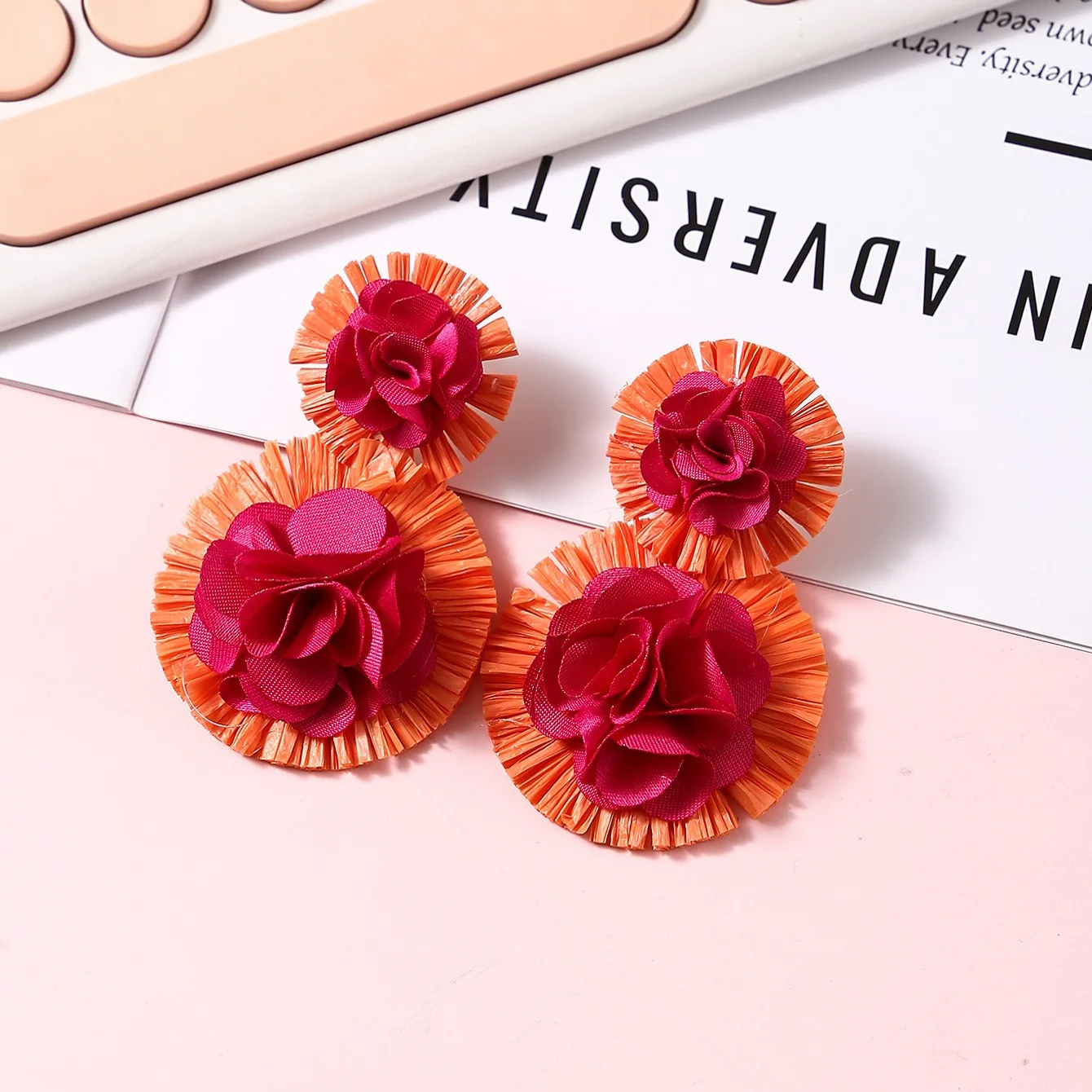 Summer Tropical Beach Earrings Raffia Straw Wrapped Hot Pink Flower Drop Earring for Women Dangle Rattan Knit Hanging Flower
