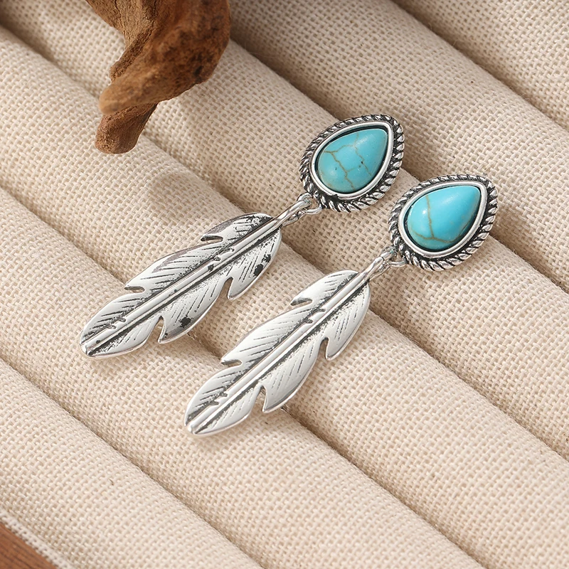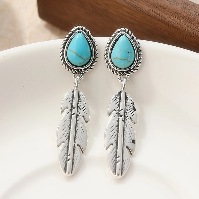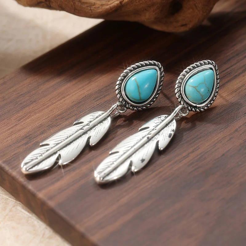 Vintage Copper Material Artisan Handmade Artificial Turquoise Silvery Feather Dangle Earrings Handmade Jewelry.