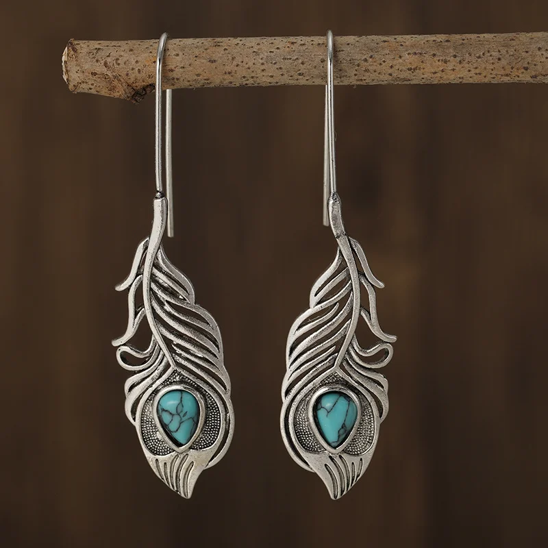 Vintage Water Droplets Red Blue Stone Earrings Ethnic Silver Color Metal Carving Pattern Dangle Earrings for Women Jewelry