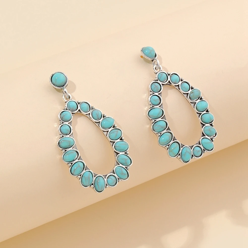 Vintage Western Jewelry 2024 New Trendy Bohemian Antique Silver Color Droplet Alloy Imitation Turquoise Dangle Earrings Women