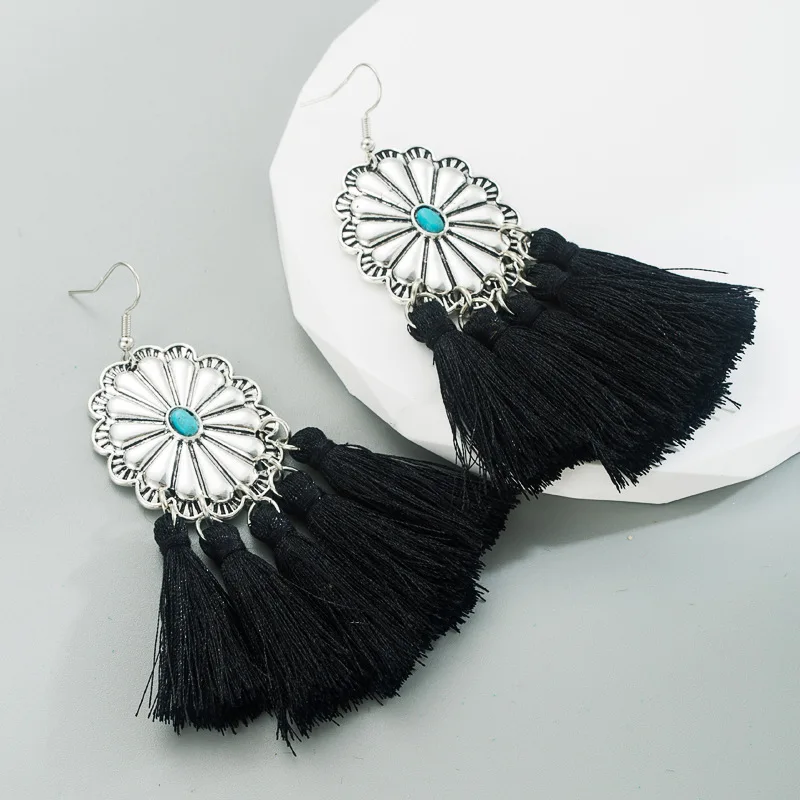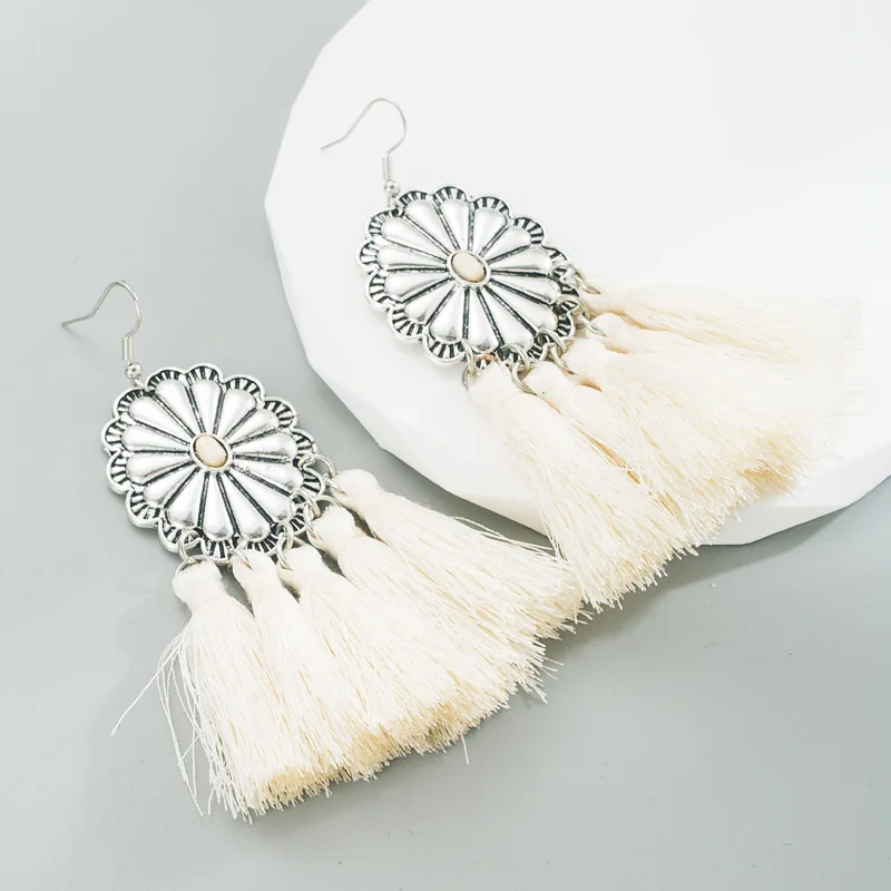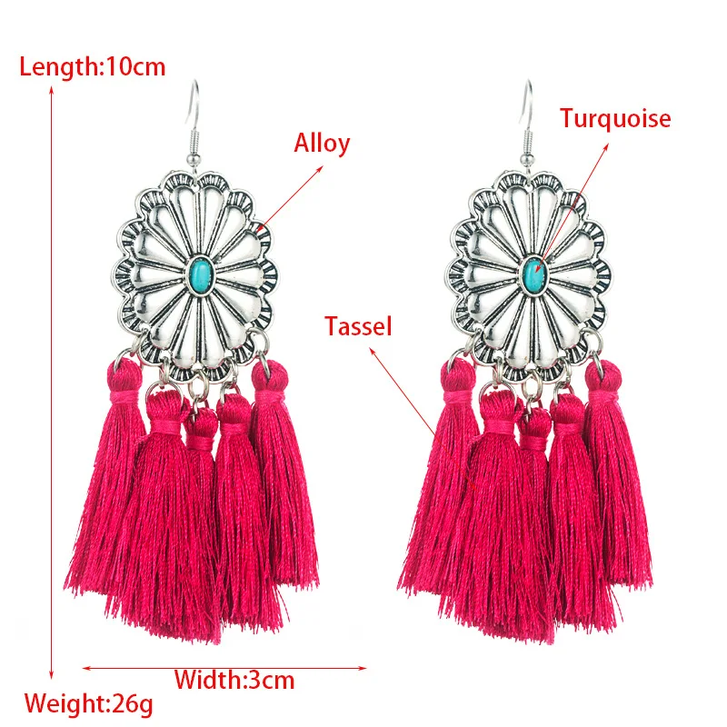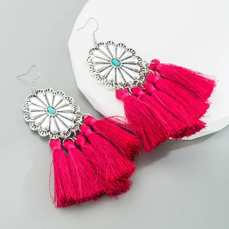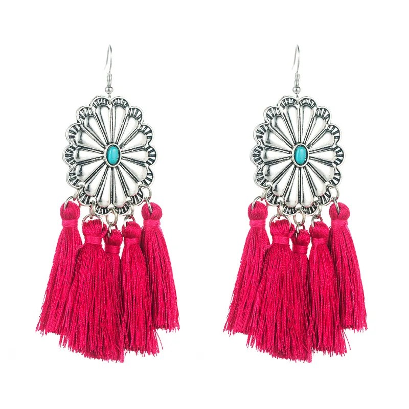 Western Style Pink Tassel Concho Earrings for Women Concho with Tassel Fish Hook Earrings Boho Chic Hot Pink/Ivory/Black