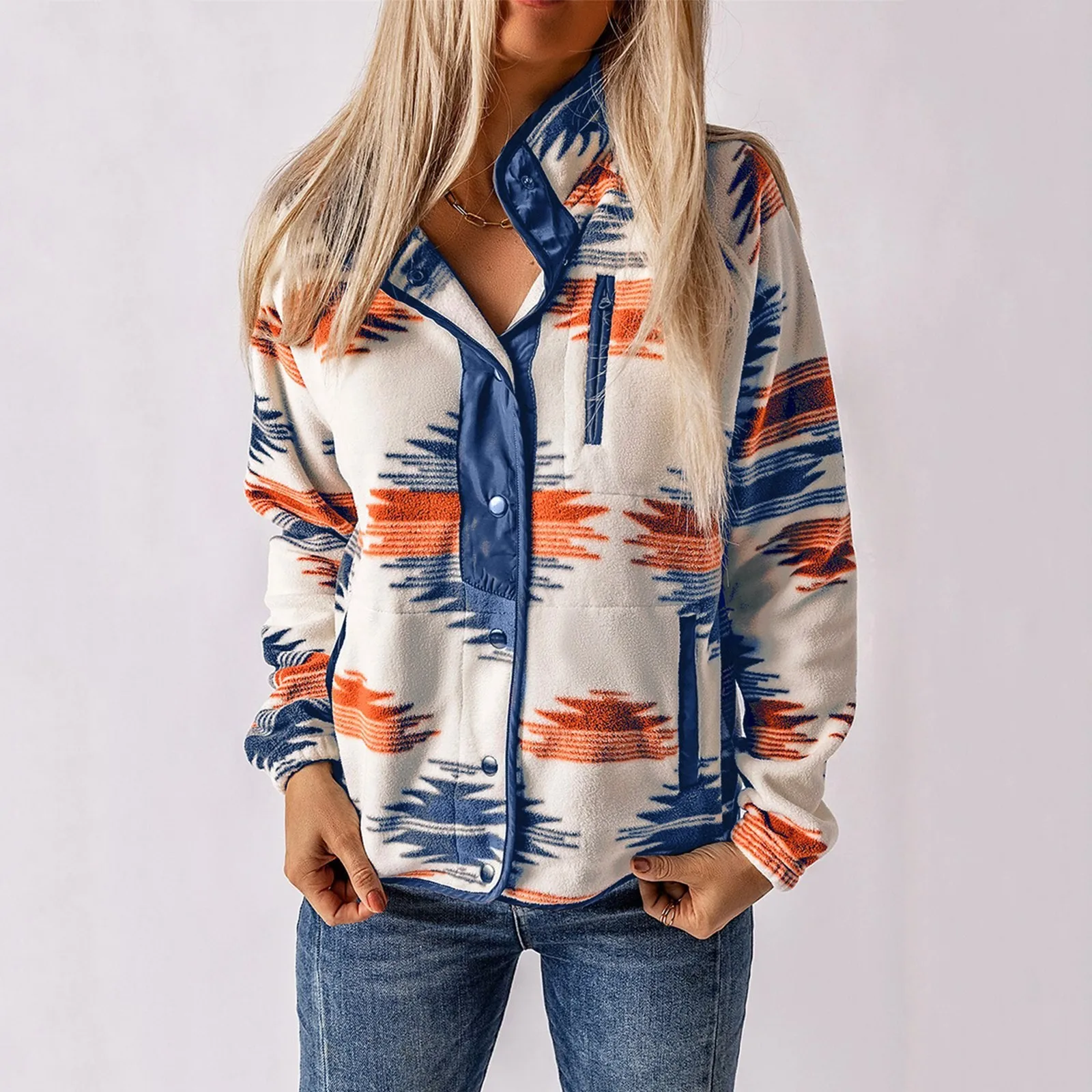 Women Autumn Winter Casual Warm Jacket Ethnic Style Printed Color Block Cardigan Fashion Button Up Coral Fleece Jacket Outwear