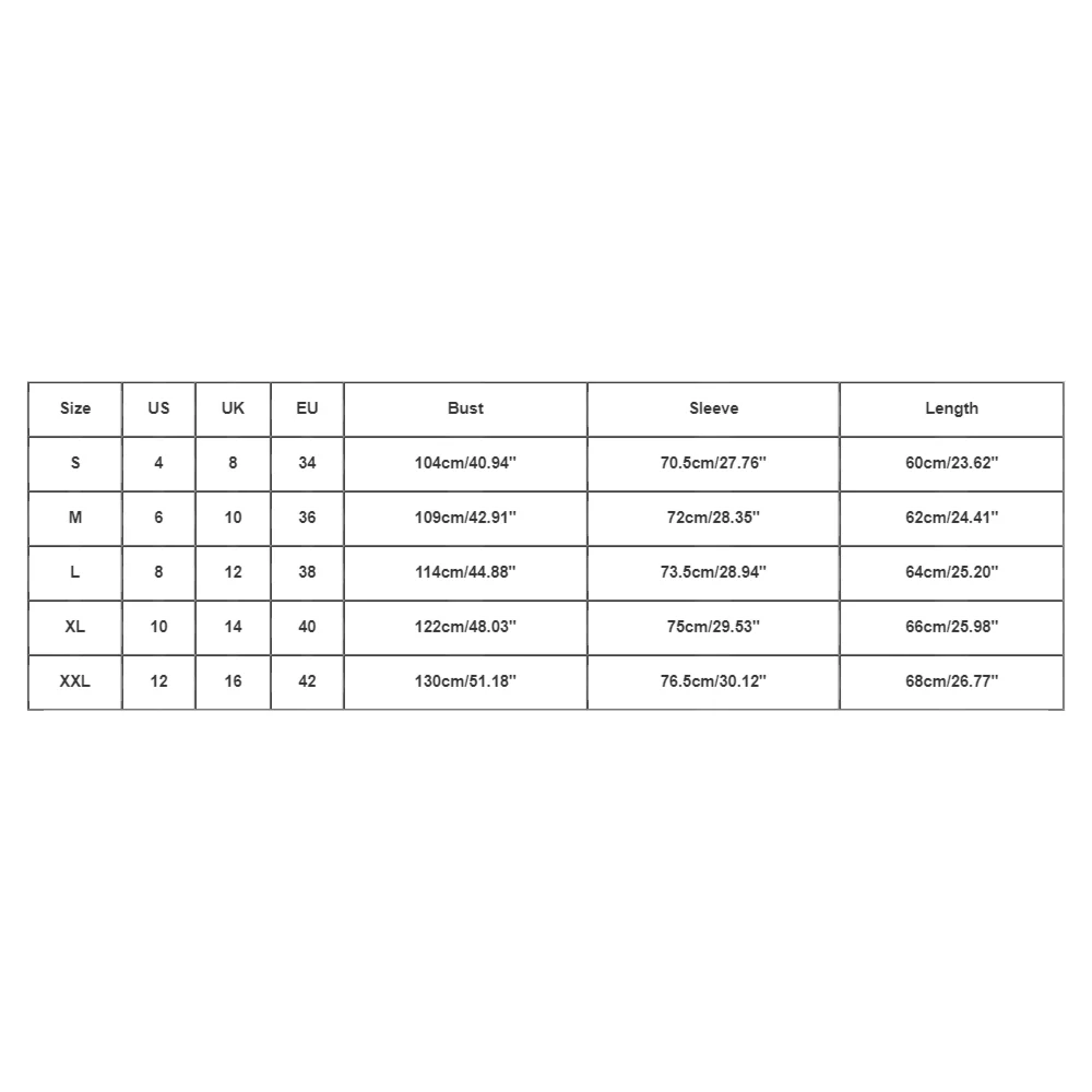 | Size:XL | US:10 | UK:14 | EU:40 | Bust:122cm/48.03'' | Sleeve:75cm/29.53'' | Length:66cm/25.98'' |